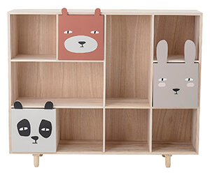 Praktikus is, mert alapelemei könnyedén alakíthatók “kamaszosabbra”, ha a gyerkőc már nem olyan kicsi. Mint például az alábbi polcos szekrény esetében: ha kivesszük a három állatos fiókot, máris bármilyen helyiségben megállja a helyét: