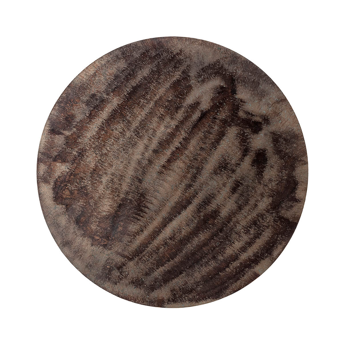 Fekete fém dohányzóasztal köralakú asztallappal, kovácsoltvas lábakkal. Az asztallap felületének végleges kialakítása kézzel történik, így az elkészült darabok színében eltérés lehet.