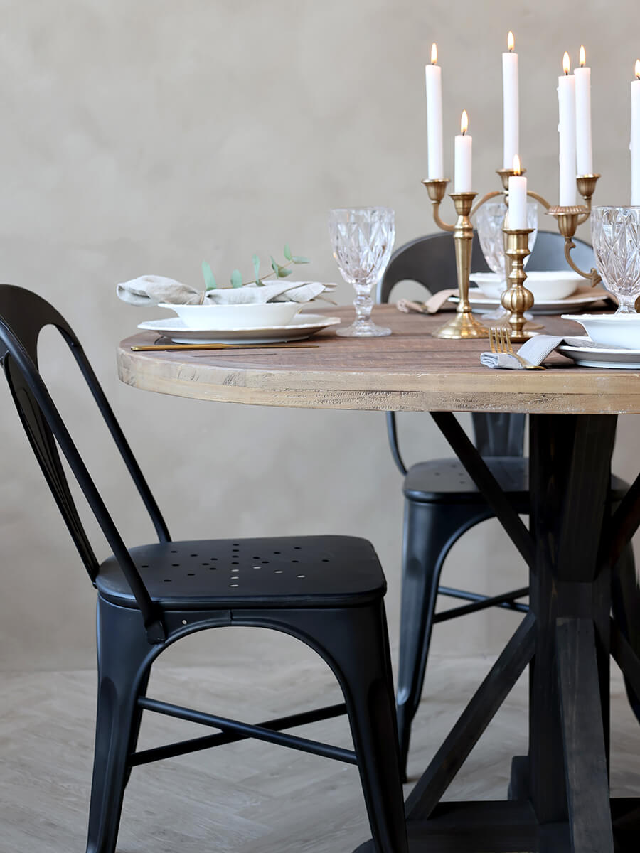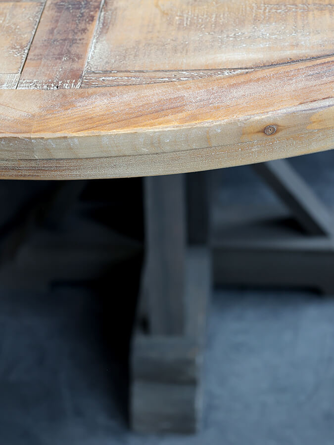 Finom provence-i hangulatú kör étkezőasztal fenyőfából. A sötét tónusú lábazat kiemeli az enyhén koptatott asztallap szépségét.