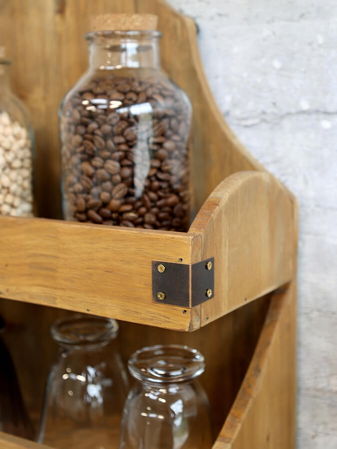 Jól kihasználható fali polc fenyőfából. Négy polca bőséges tárolóhelyet kínál, szépen faragott felső része kecsessé teszi. A polc végi zsanérok finom vintage hangulatot kölcsönöznek neki.