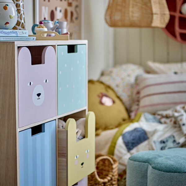 A Villja nyuszi könyvállvány aranyos, nyuszis formavilágával és praktikus rekeszeivel vidám kiegészítője minden gyerekszobának. FSC® tanúsított MDF-ből készült.