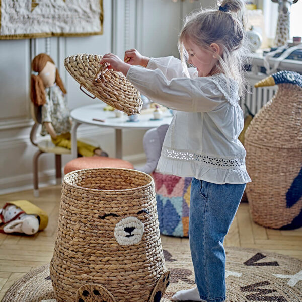 Nyitott tárolókosár bankuan fűből, melynek varázsát oroszlános külseje adja. Oldalai merevítettek, így gyorsan bele tudsz pakolni. Praktikus és egyszerre dekoratív, igazi skandináv gyerekszobai kiegészítő.