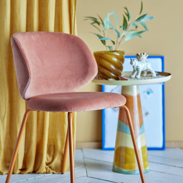 Étkezőszék lenyűgöző bársony huzattal és azonos árnyalatú fém lábakkal. A meleg tónus és a letisztult design harmonikus összhangja.