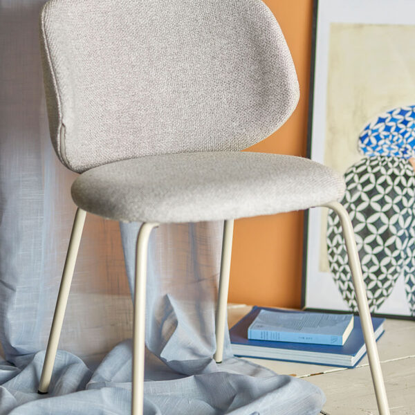 Étkezőszék gyönyörű szürke buklé szövettel és azonos árnyalatú fém lábakkal. Letisztult vonalak, monokróm kialakítás.