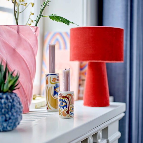 Vörös bársony díszíti ezt a modern designnal kialakított asztali lámpát, amely egy csipetnyi eleganciát és bohém hangulato ad otthonod dekorációjához.