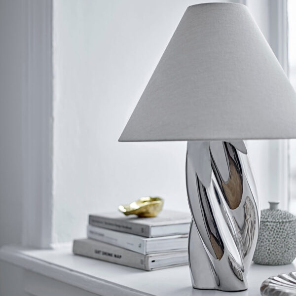 Asztali lámpa ezüst színben, egyedi designnal és fényes króm bevonattal.