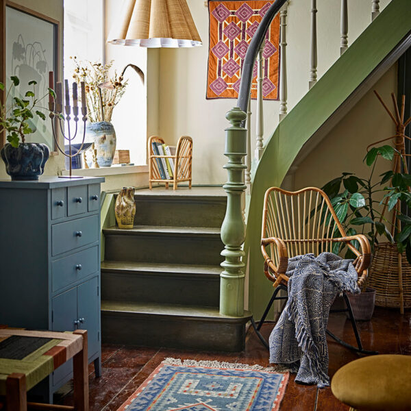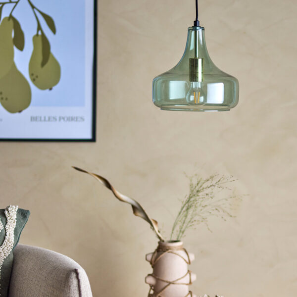 Zöld üveg függőlámpa minimalista megjelenéssel, amely letisztult skandináv hangulatot kölcsönöz a térnek.