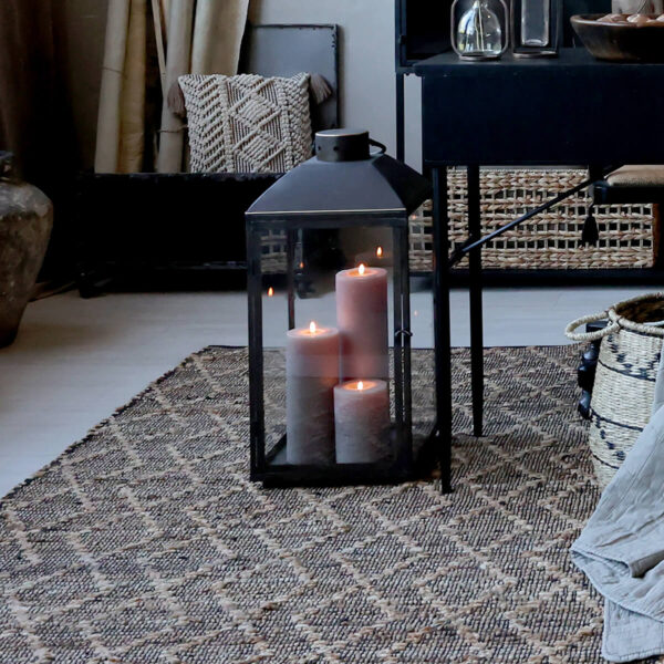 Gyönyörű textúra jellemzi ezt a pamut szőnyeget, amely sötét, geometriai mintájával klasszikus skandináv darab.