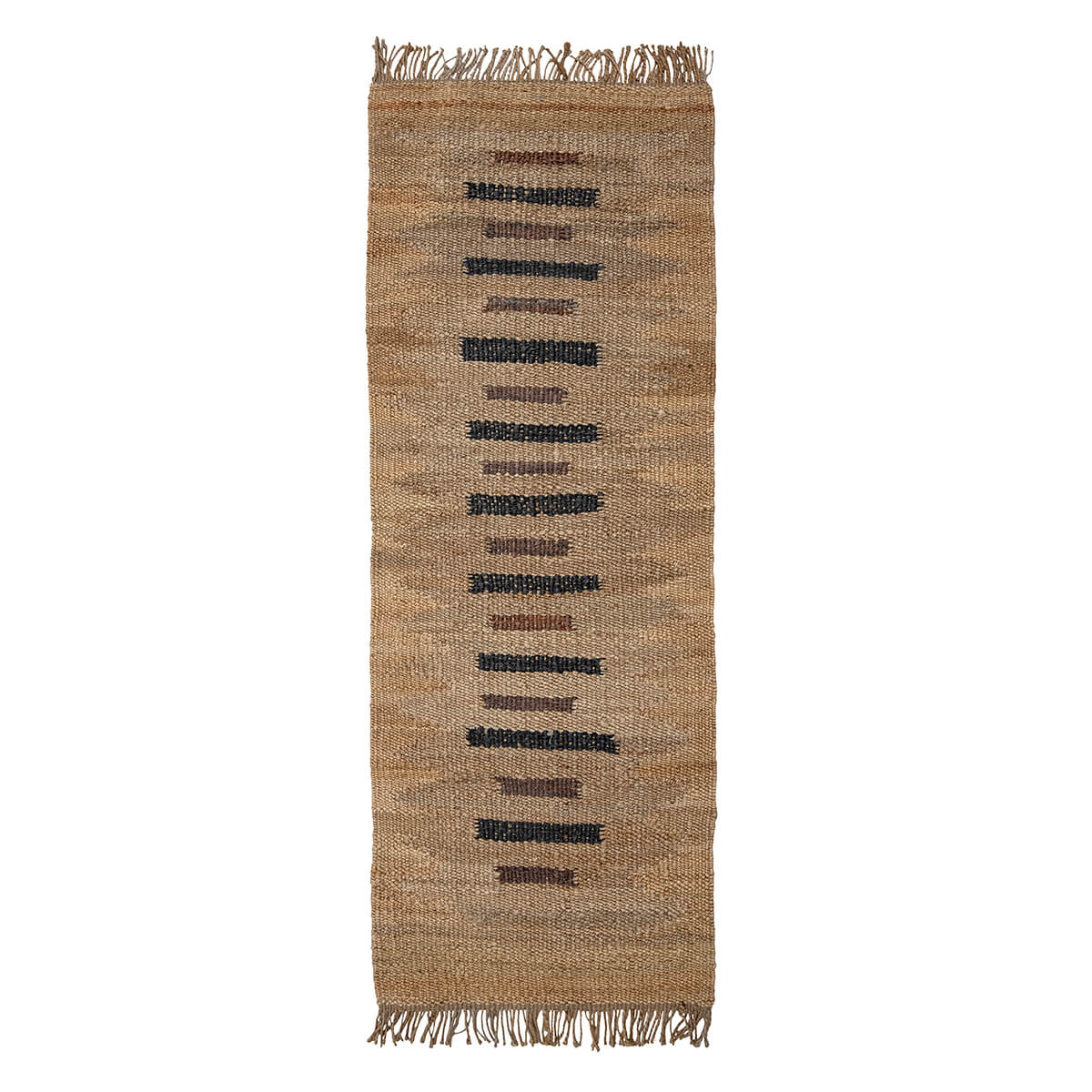 Juta futószőnyeg, melyet sötétbarna és fekete bőr szövött minta díszít. Finom és elegáns megjelenése teszi különlegessé.
