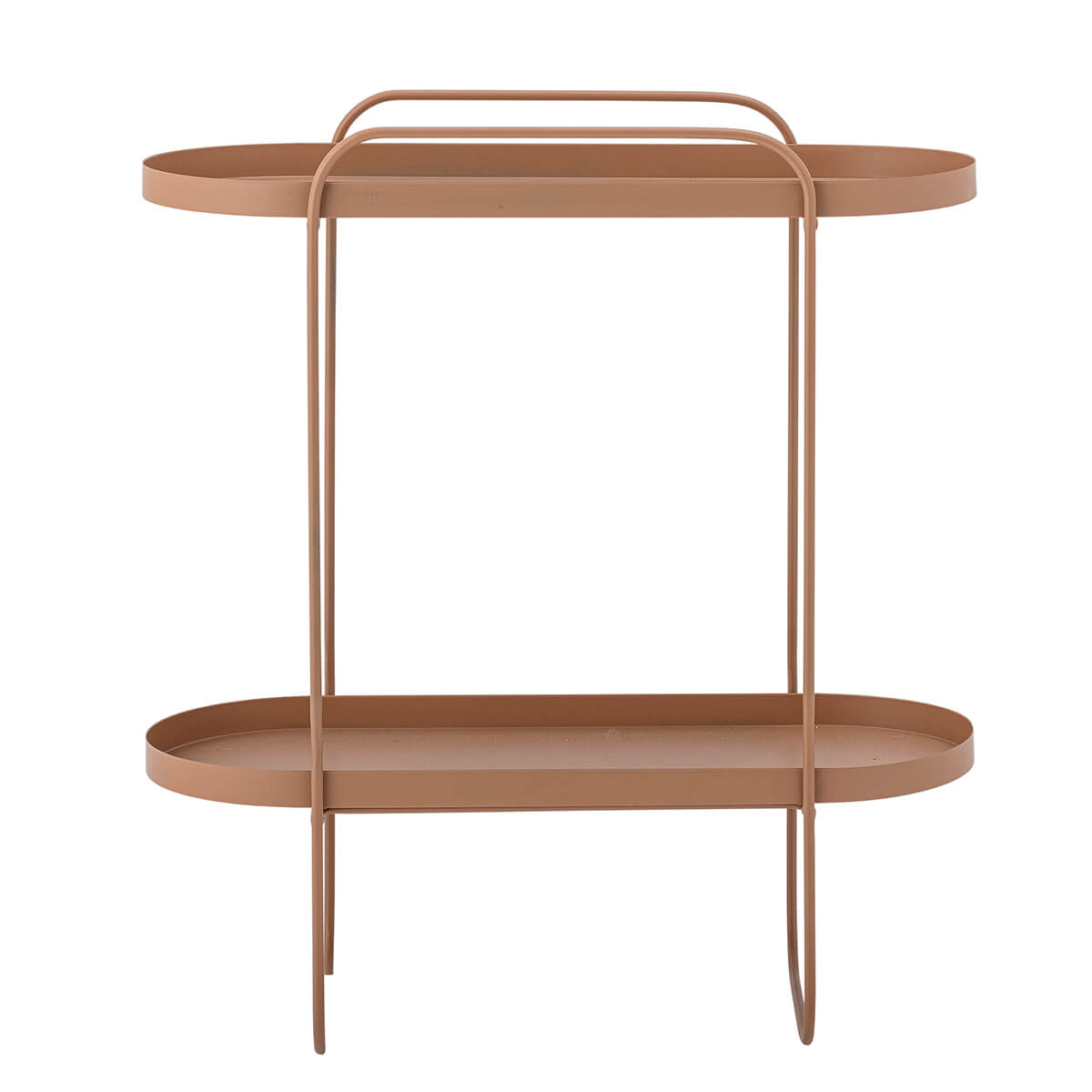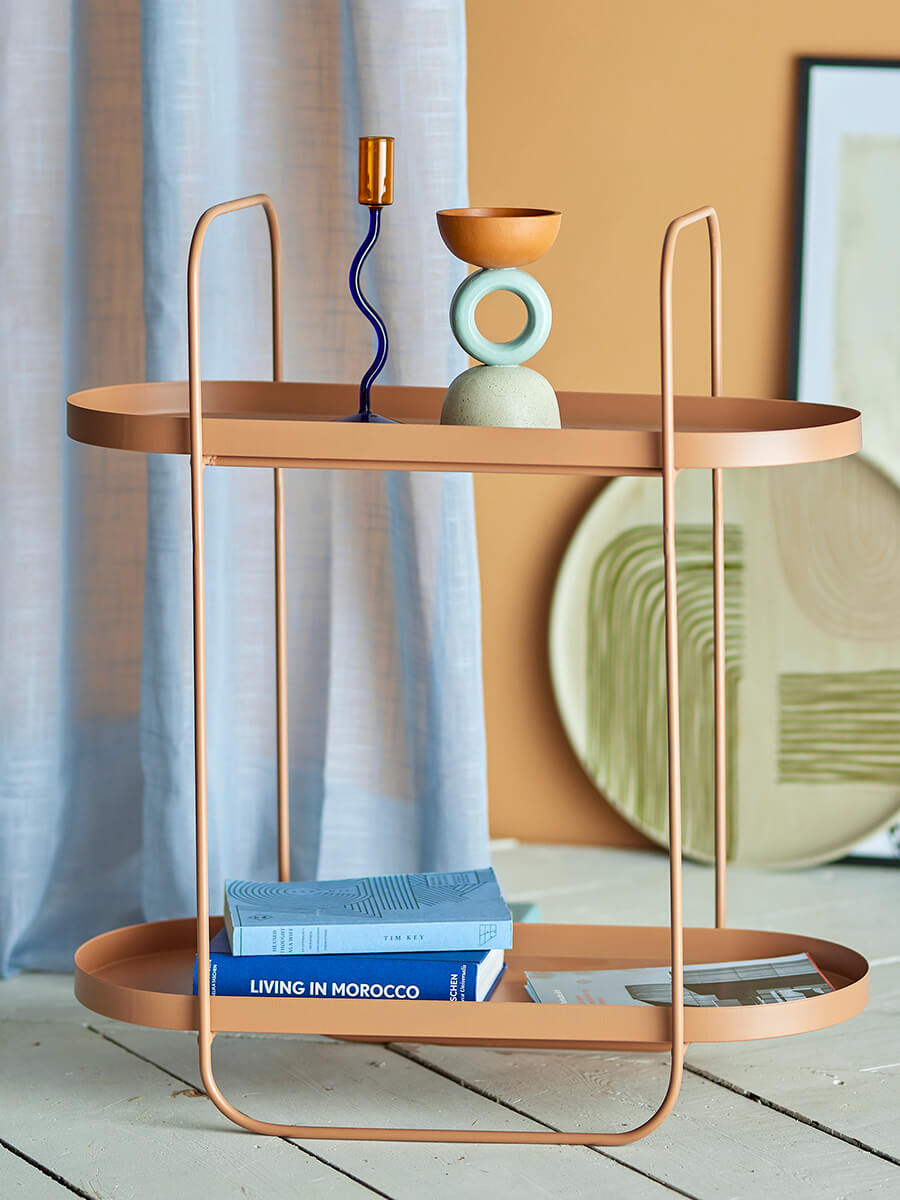 Fém kisasztal meleg tónusú barna színben, két polccal. Ovális kialakítása könnyed, stílusos megjelenést ad neki, praktikus és dekoratív.