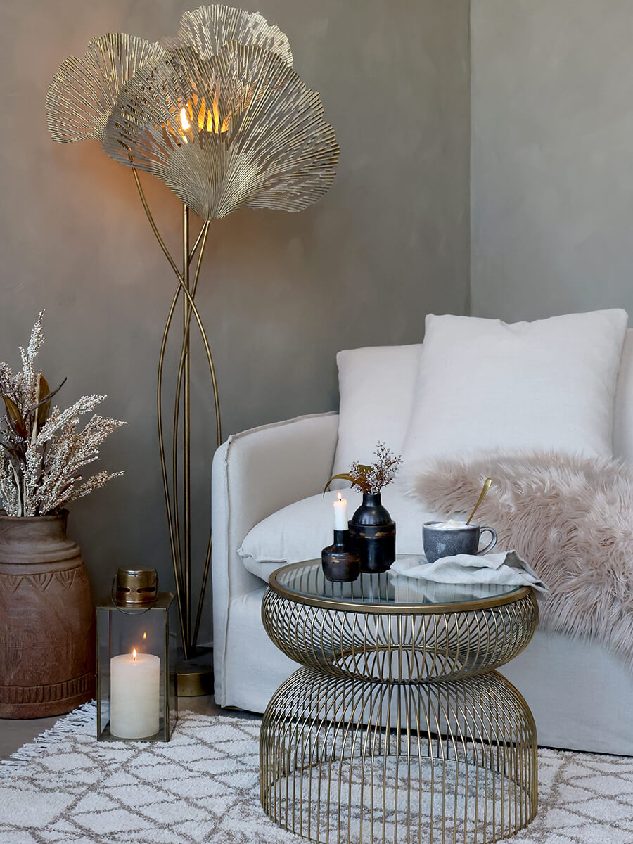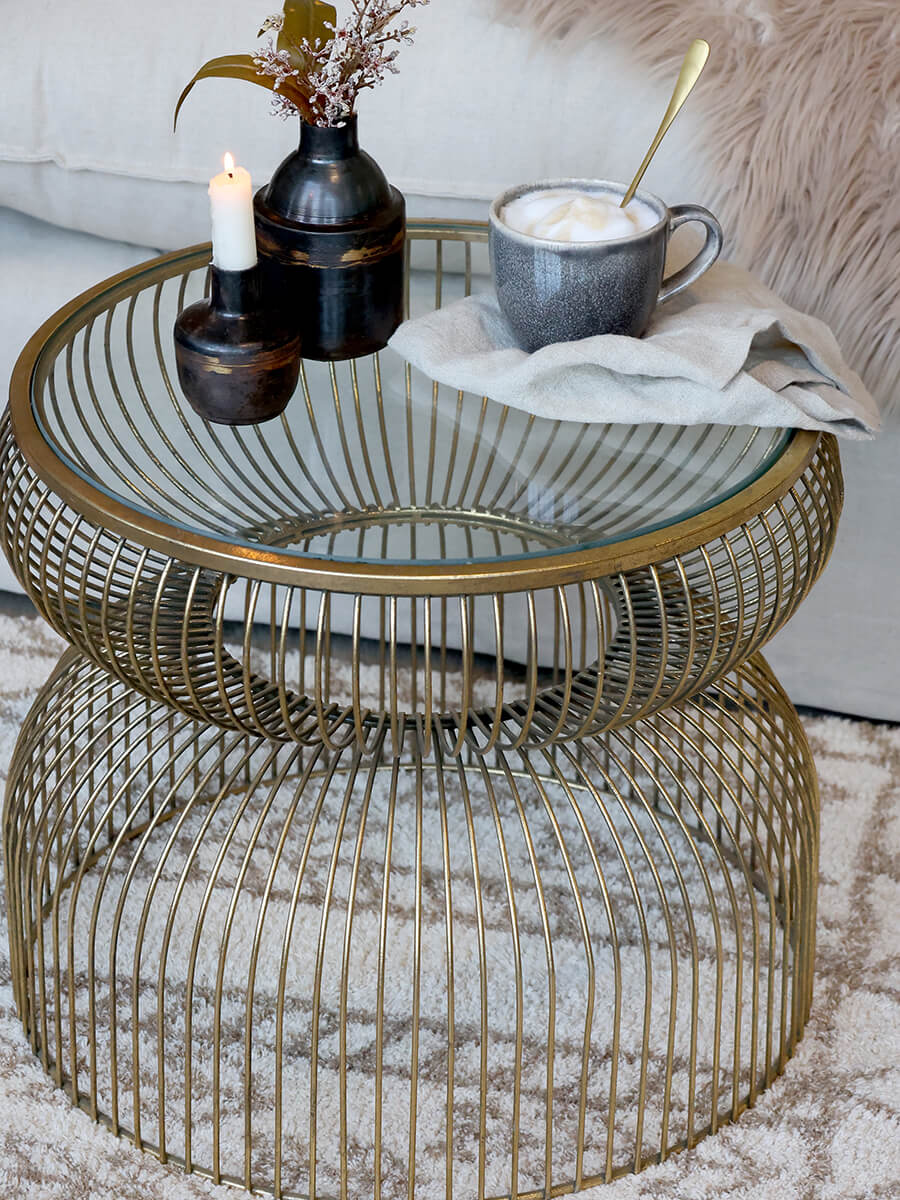 Bronz színű kisasztal üveg asztallappal, mely eleganciát hoz a helyiségbe. Kézzel készített fém váz antik sárgaréz megjelenéssel és könnyű üveg asztallappal.
