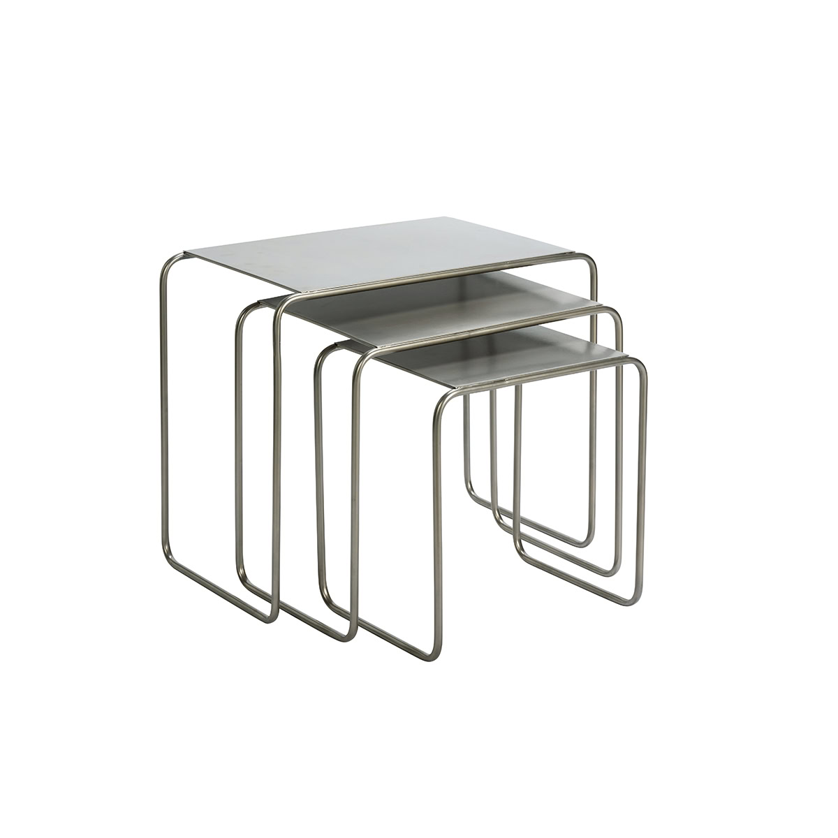 Az Egymásba illeszthető fém lerakóasztal szett – acélszürke színben letisztult, ipari hangulatú hármas asztalszett, amely rugalmasan alkalmazkodik a térhez – együtt és külön is tökéletes választás.
