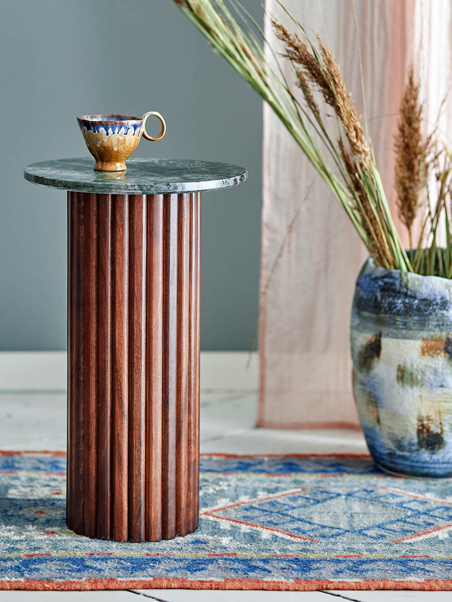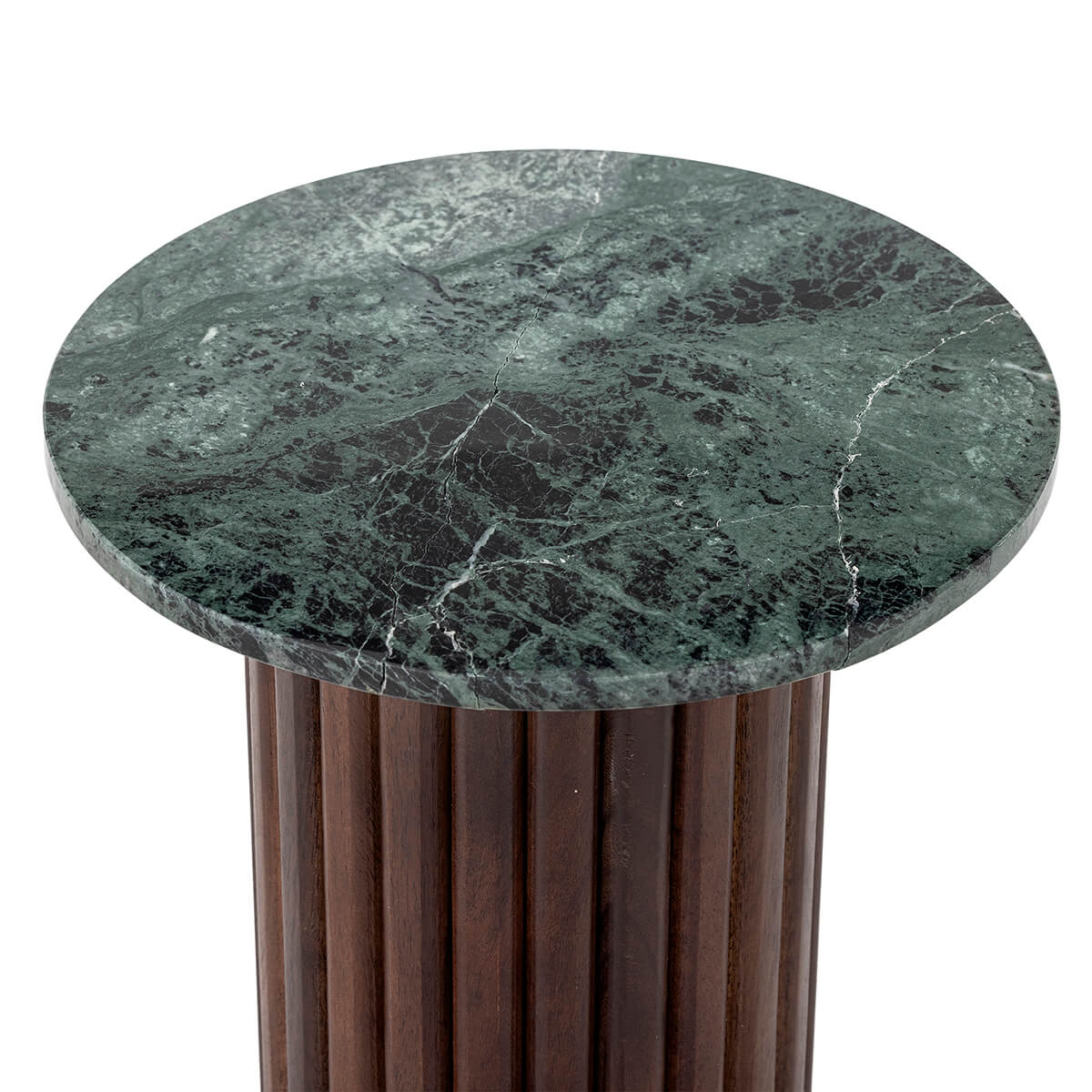 Márvány lerakóasztal mangó fából készült alapon. A tömör, sötét fából készült alappal és zöld márványlappal az asztal egyszerre erős és elegáns, időtlenséget kölcsönözve a dekorációnak. Tökéletesen alkalmas a nappaliban a kedvenc szobanövényed vagy egy központi dekor elem bemutatására, vagy a kanapé mellett lerakóasztalként.