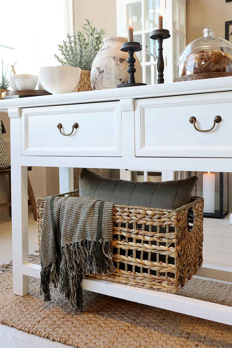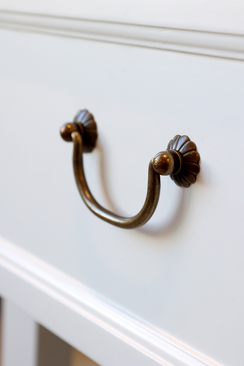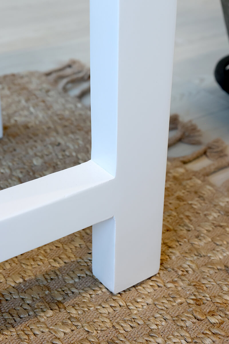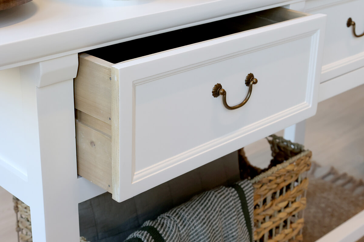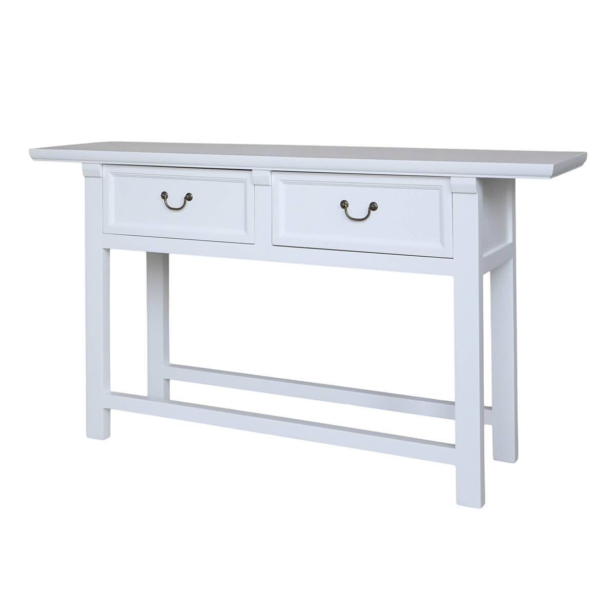 Konzolasztal fehérre festett újrahasznosított fenyőből, két fiókkal. Széles asztallapja és mély fiókjai sok tárolófelületet biztosítanak.