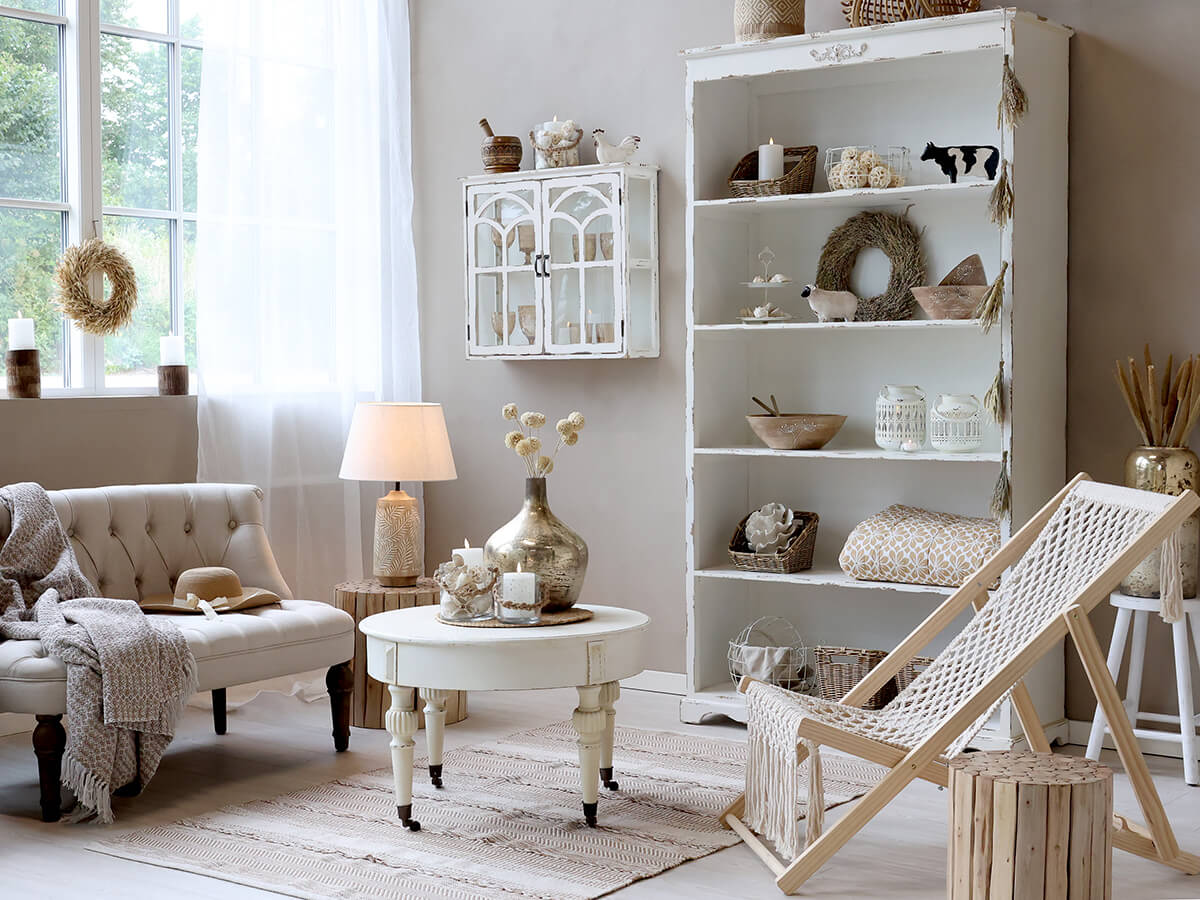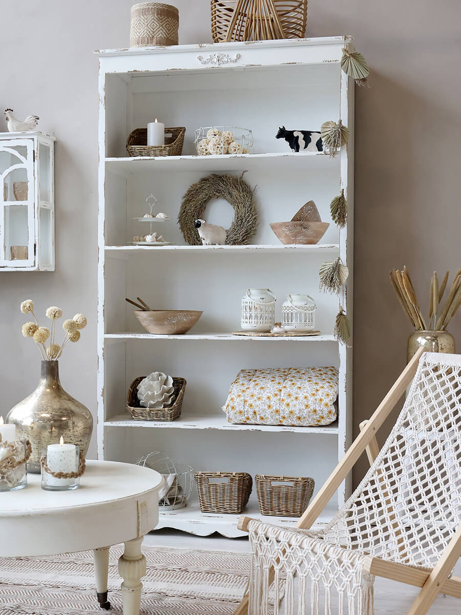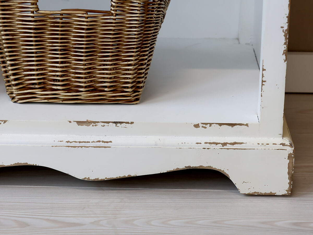 Fehér fa polcos szekrény, mely koptatott felületével igazi vintage hangulatot áraszt. Öt polca bőséges tárolóhelyet biztosít a nappaliban vagy az étkezőben.