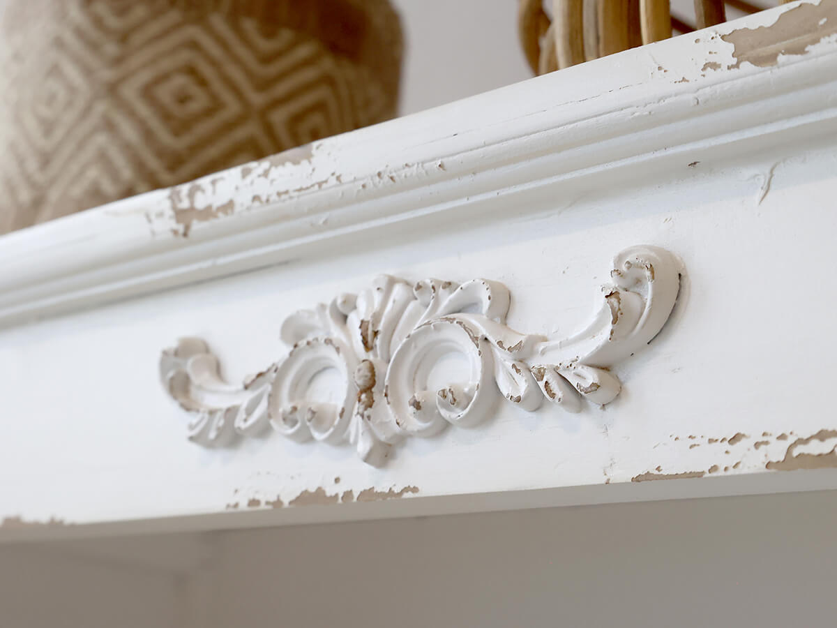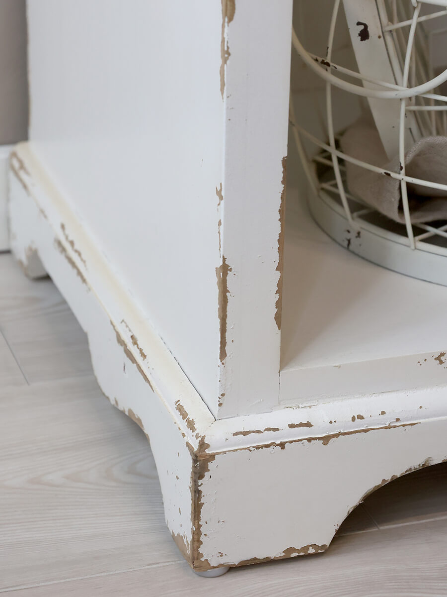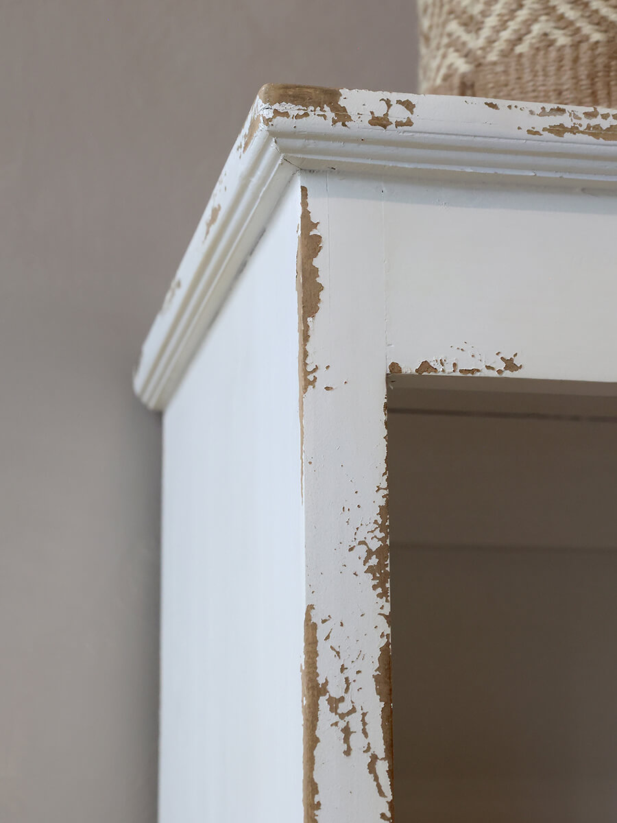Polcos szekrény fenyőfából, erősen koptatott fehér színben. Tetejét stílusos motívum díszíti.