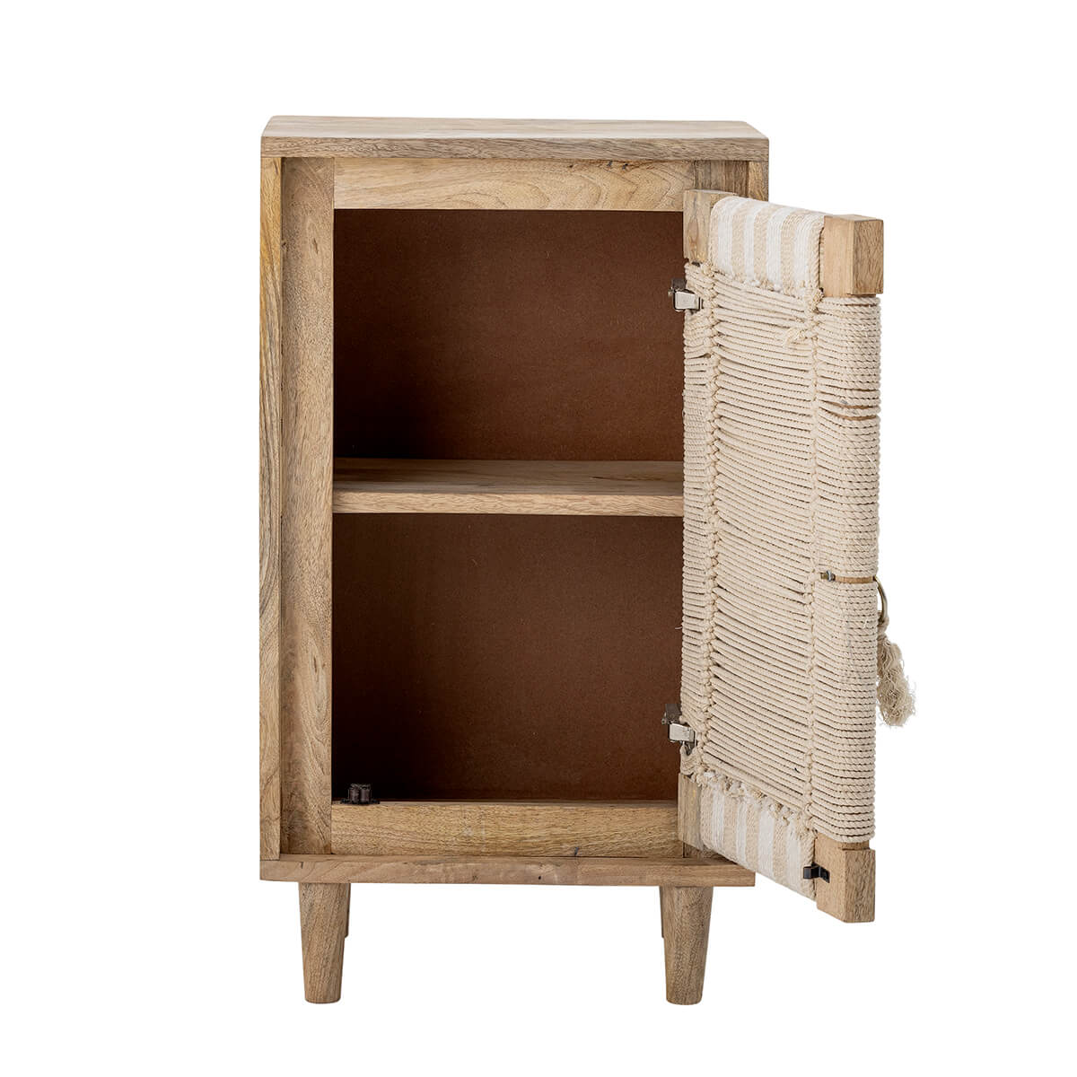 Mangófa éjjeli szekrény két polccal, melyet pamutból szőtt, natúr színű ajtó zár. Natúr kiegészítő természetes anyagokkal.