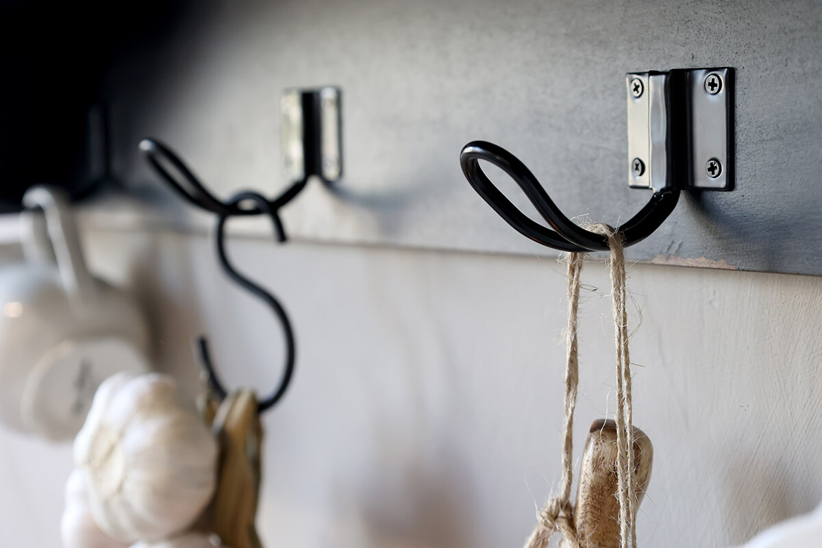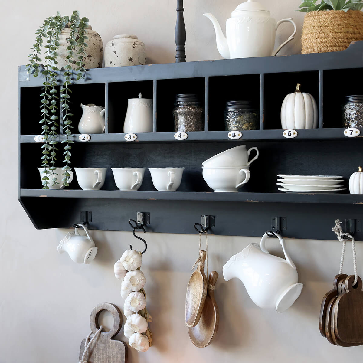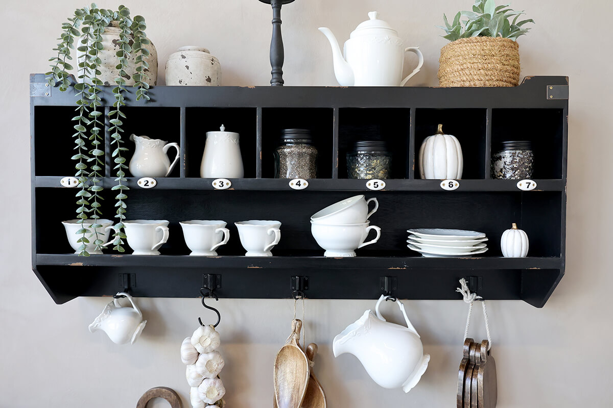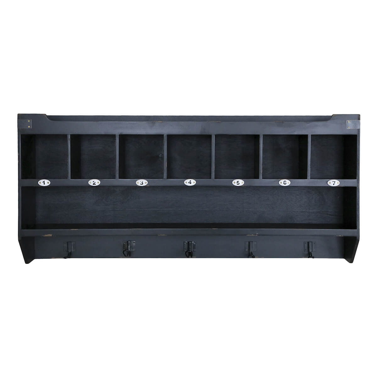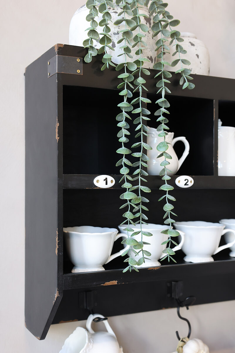 Fali polc antik fekete színben. Egy hosszú polc, 7 rekesz és 5 akasztó használható fel a kreatív tároláshoz. Ideális konyhában kedvenc bögréid megjelenítésére.