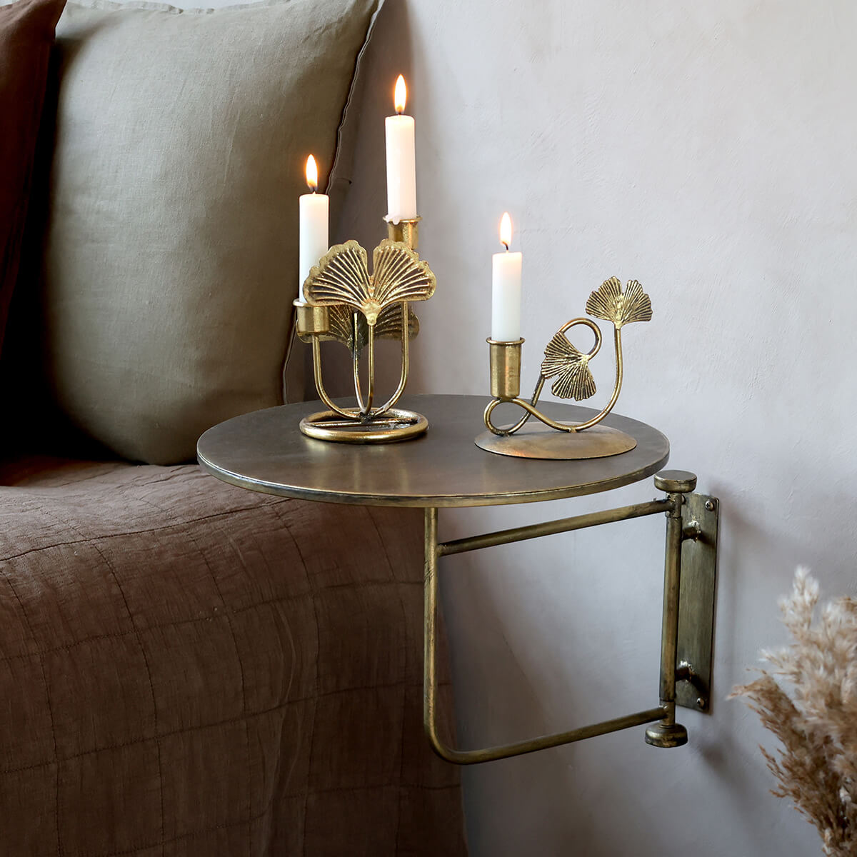 Falra szerelhető kör alakú polc bronz színben. Könnyed, légies megjelenésével lehet akár éjjeli szekrény, virágtartó, vagy a pohártartó kisasztal a kanapé mellett.