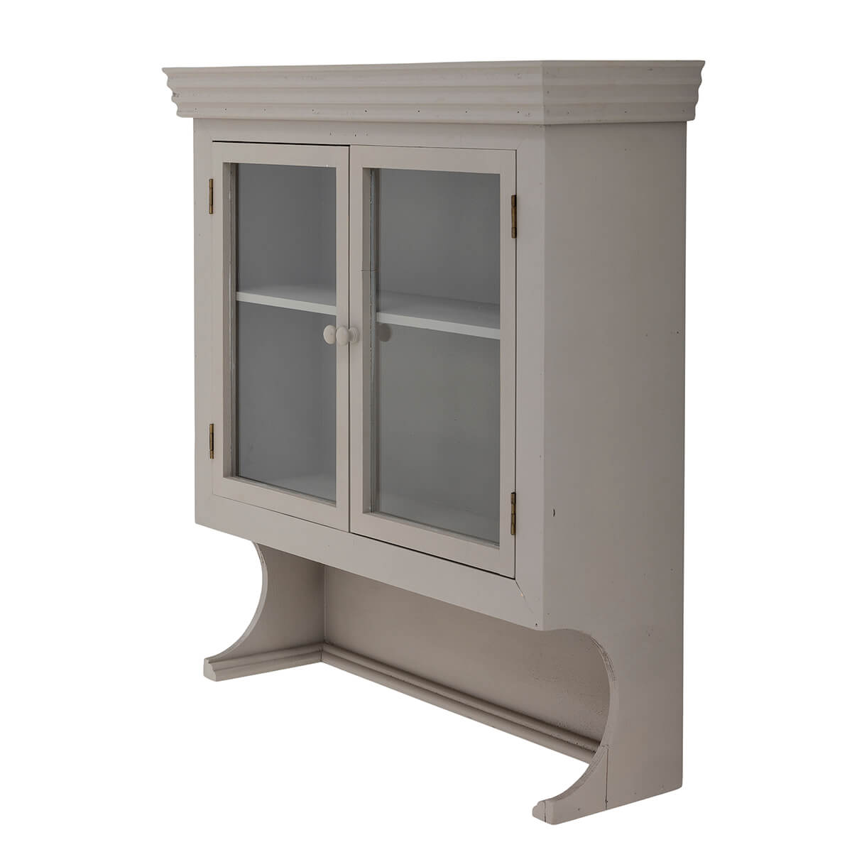 Szürke fenyő fali szekrény üveg ajtókkal, egyszerre praktikus és lenyűgözővé teszi a tárolást. Enyhén patinás megjelenése vintage hangulatot kölcsönöz neki.