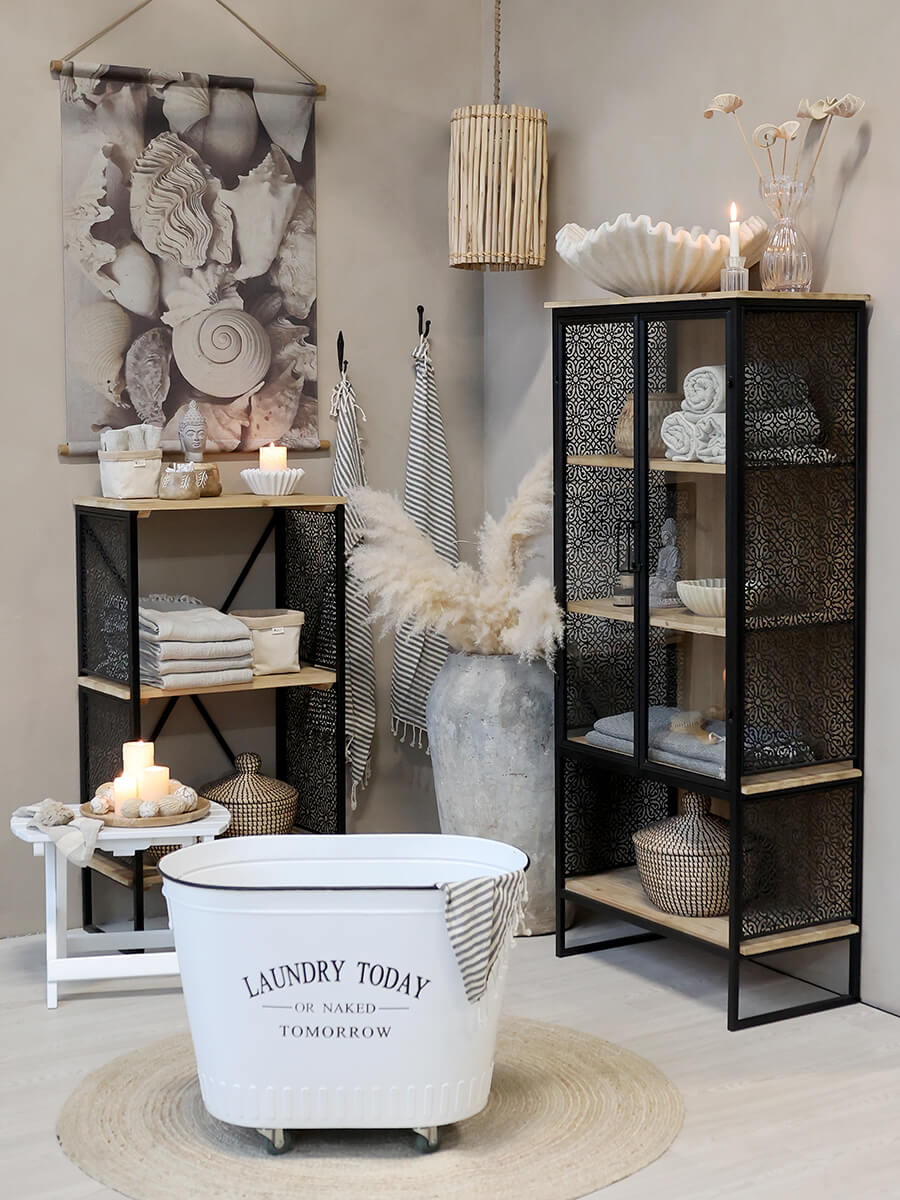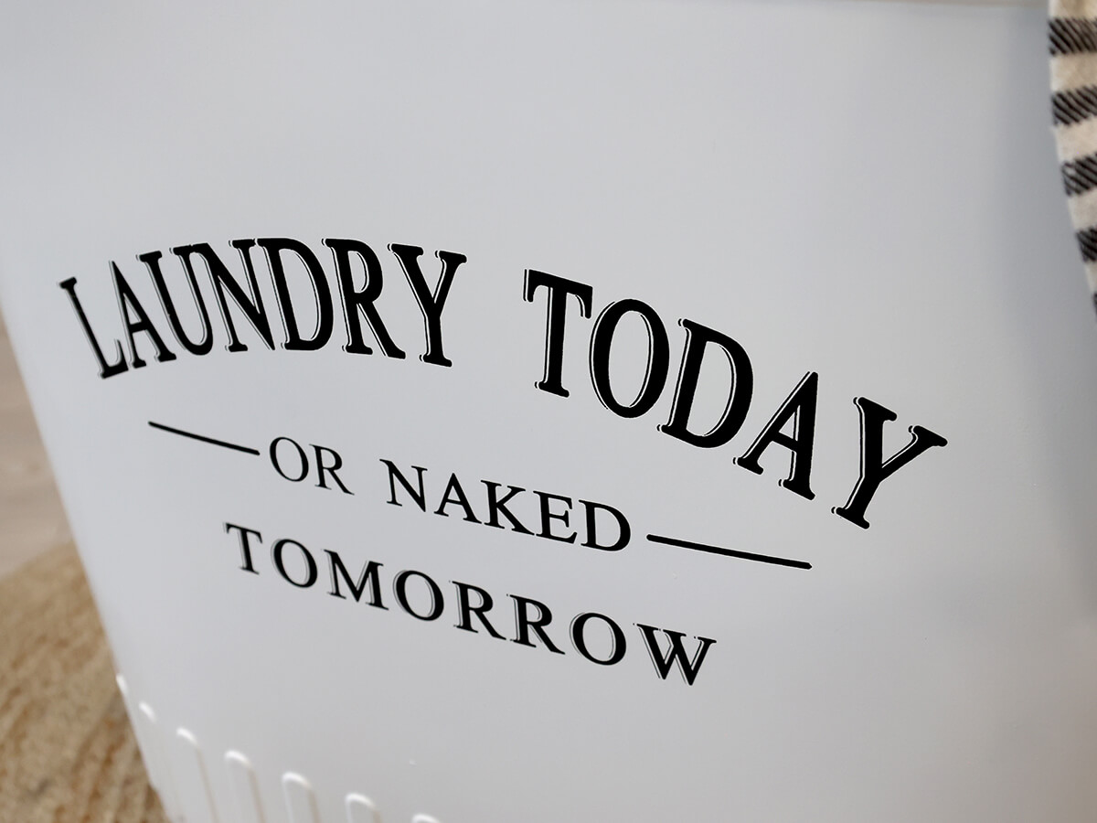 Fém szennyestartó kosár „mosás ma vagy meztelenül holnap” felirattal. Minimalista, letisztult kiegészítő, amit praktikusan használhatsz.