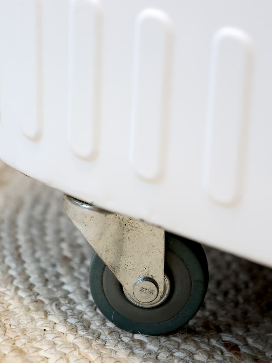 Szennyestartó kosár fémből. Kerekeinek és fogójának köszönhetően könnyen mozgatható.