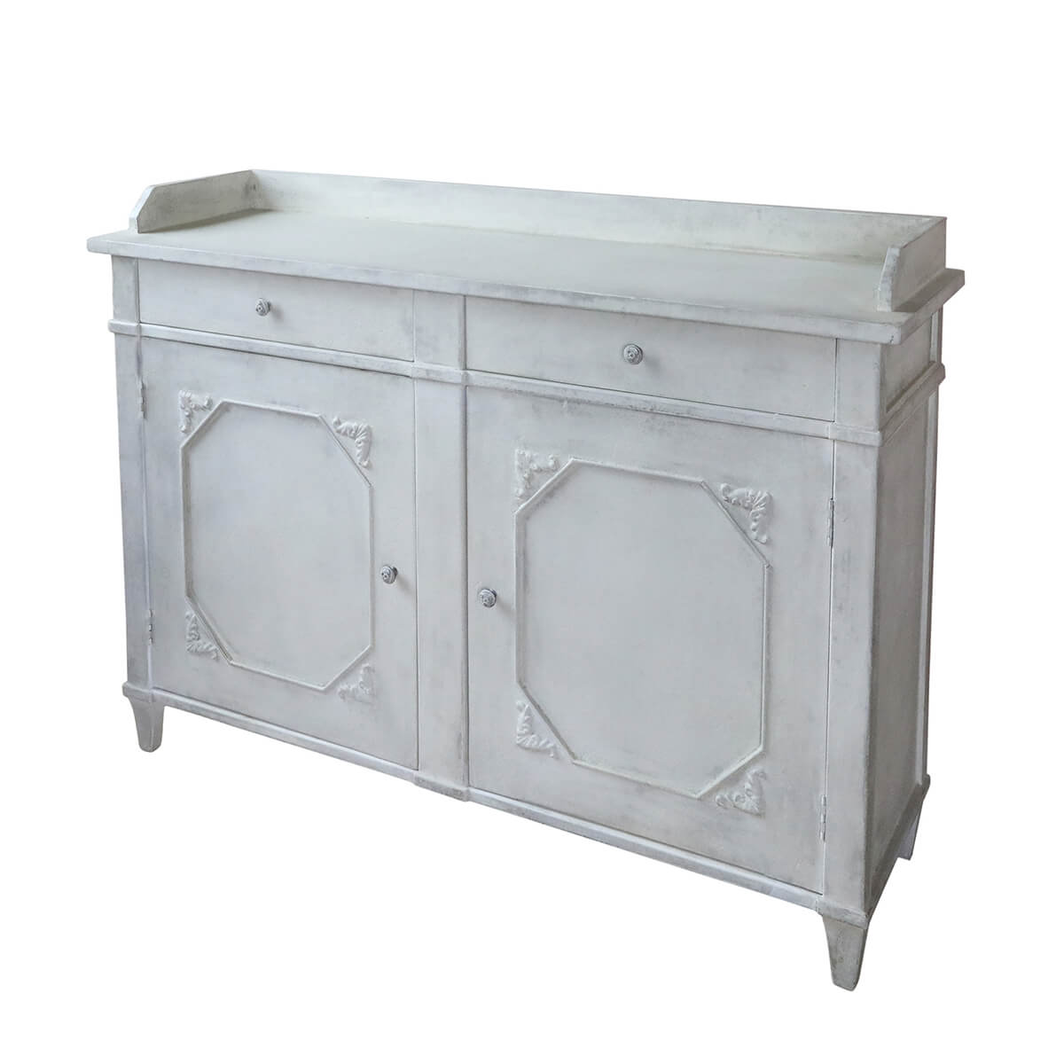 Fehér tálalószekrény vintage hatásúra koptatva, fenyőből. Akár a nappaliban komódként is használható.