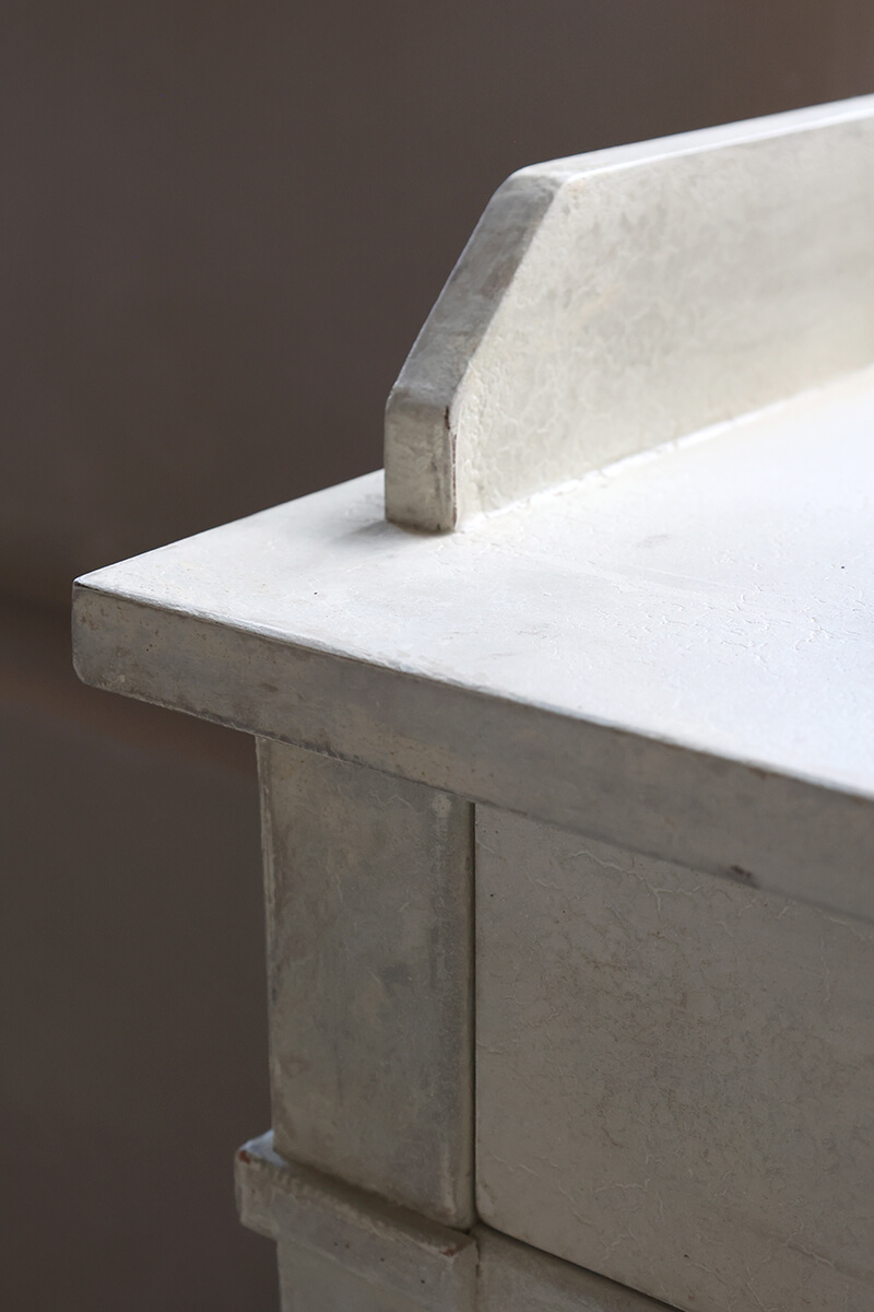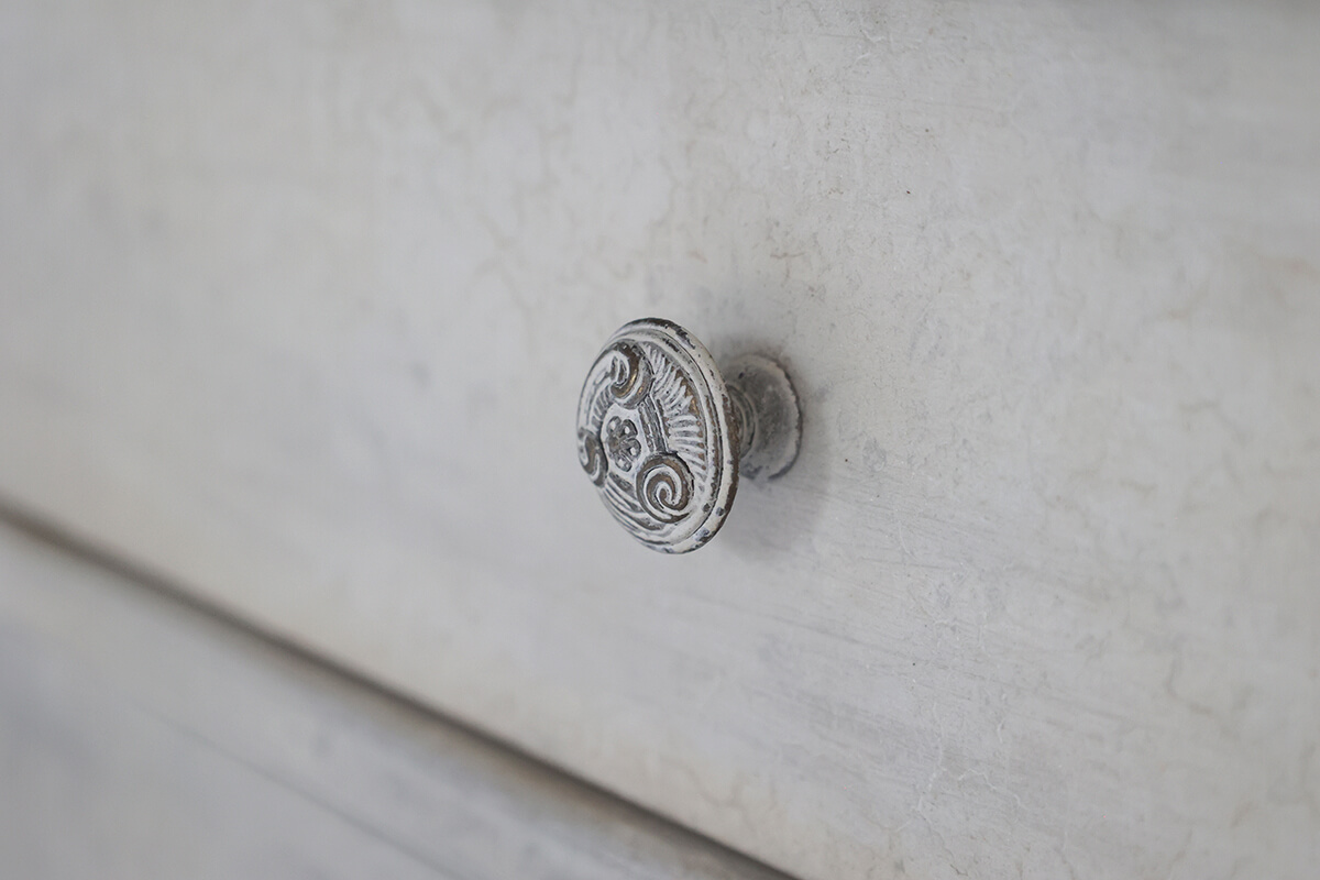 Vintage fehér tálalószekrény koptatott megjelenéssel. A két ajtó belül négy tágas rekeszt rejt.