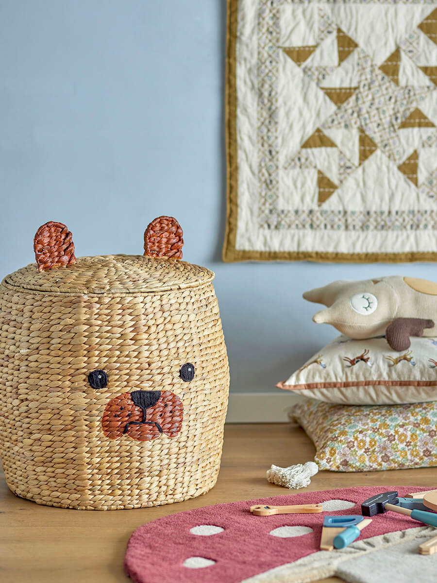 Gyerekszobai tároló kosár leemelhető fedővel, természetes anyagból, kedves mintával.