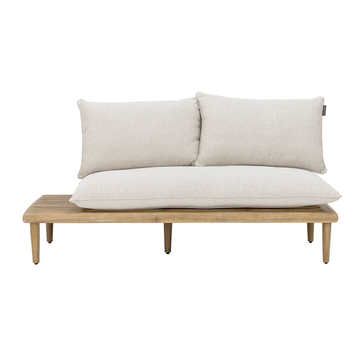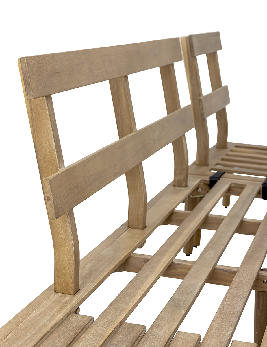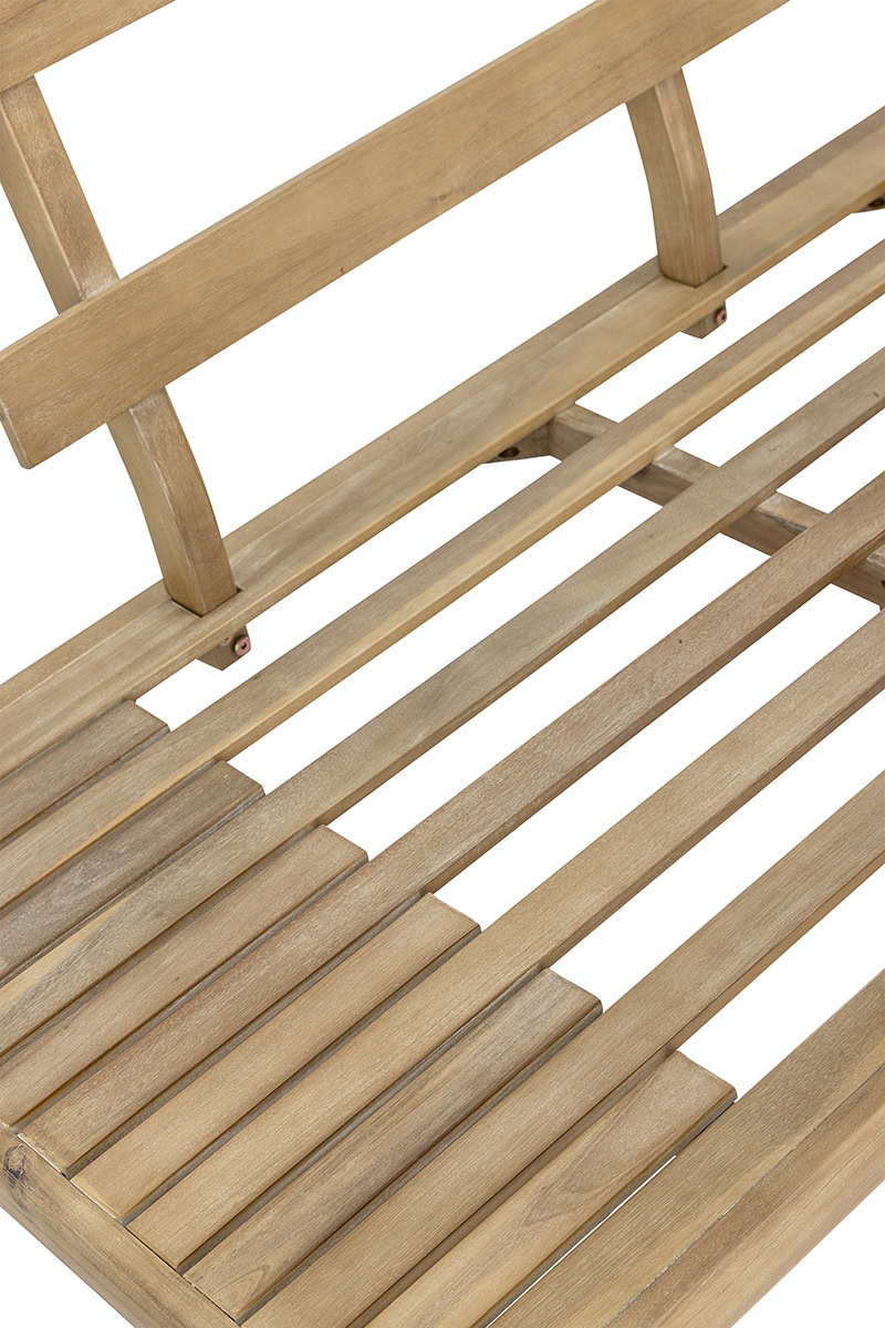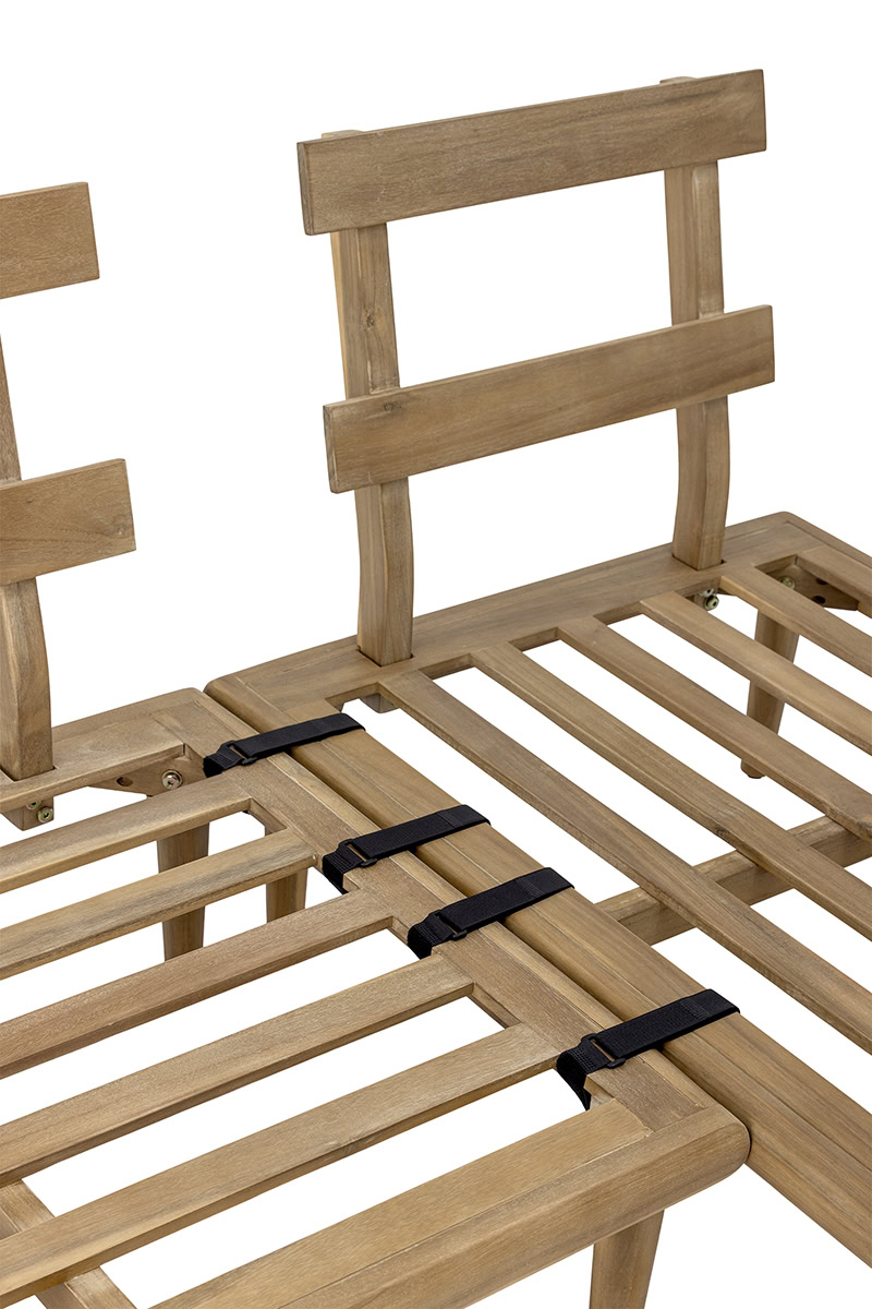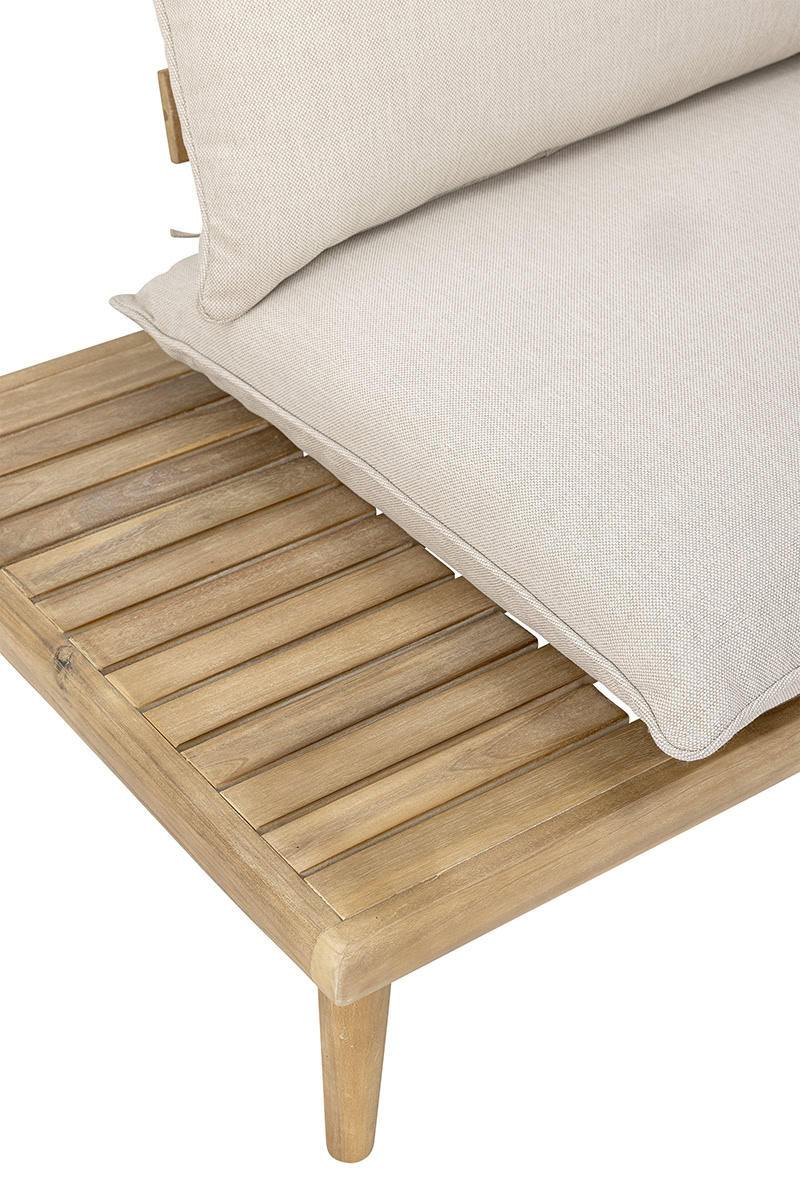 A háromrészes szett egy kényelmes kanapéból, egy napozó/fekvő elemből és egy alacsony dohányzóasztalból áll, így tökéletes helyszínt teremt a pihenéshez, beszélgetésekhez vagy egy nyári délutáni kávéhoz. A bézs párnák lágy kontrasztot alkotnak a fa természetes árnyalatával, huzatuk 40°C-on mosható, így a praktikum sem marad el az esztétikum mellett.