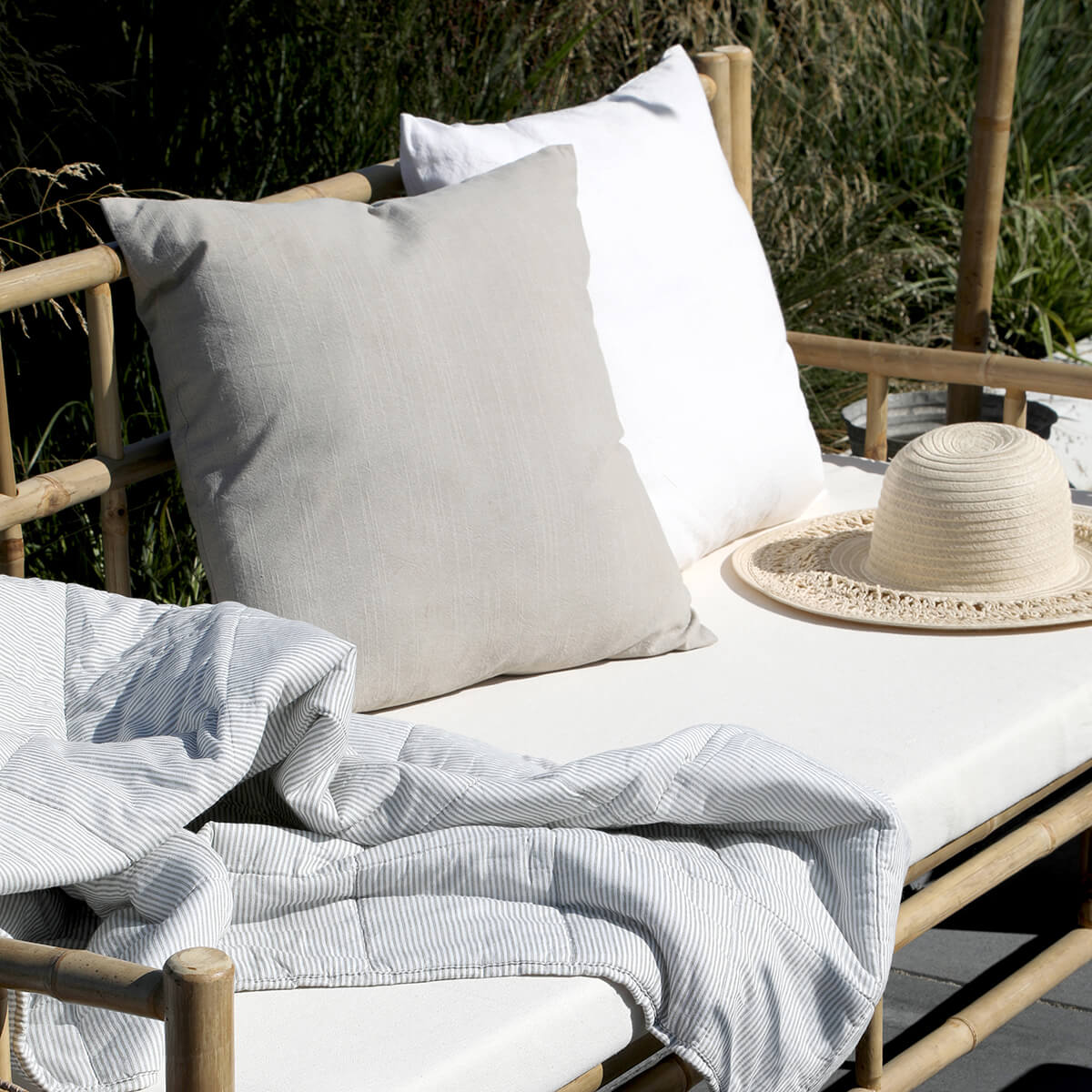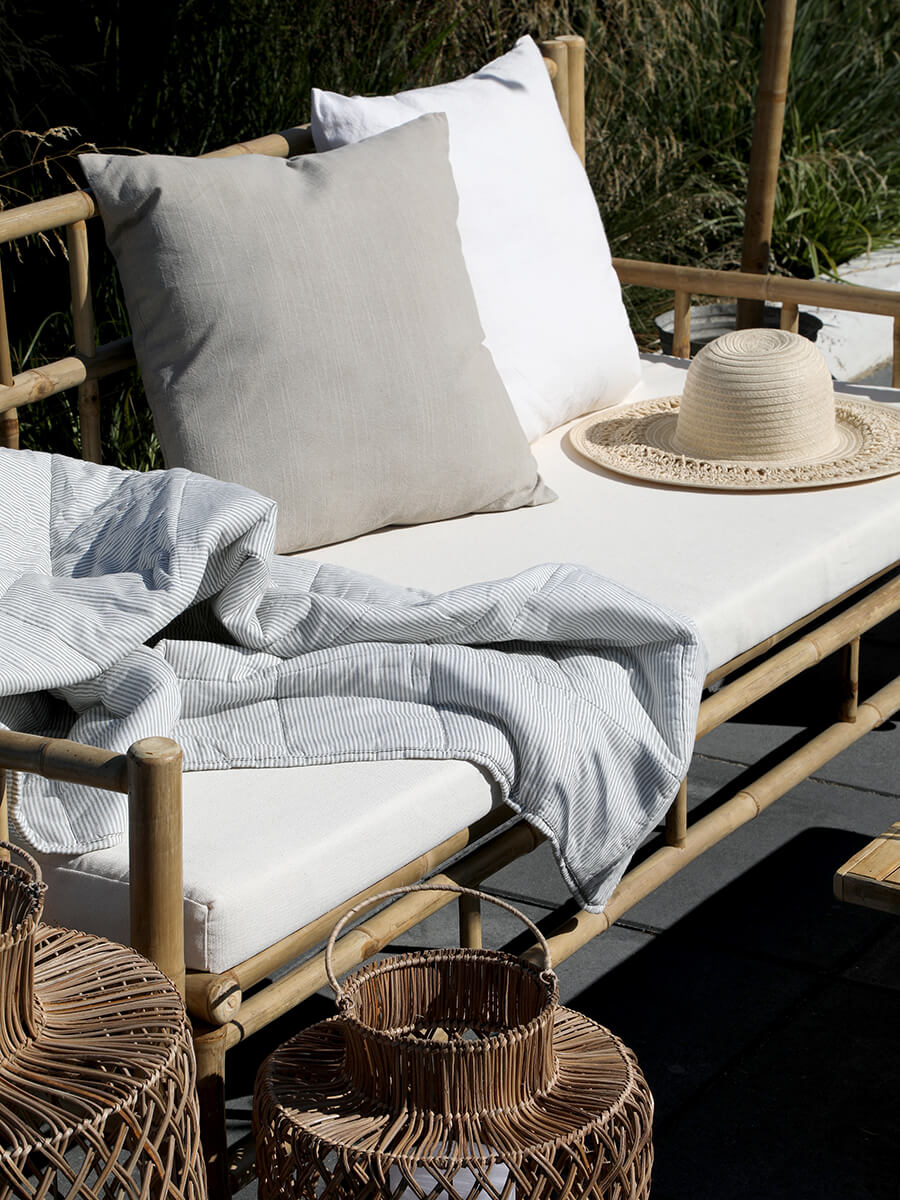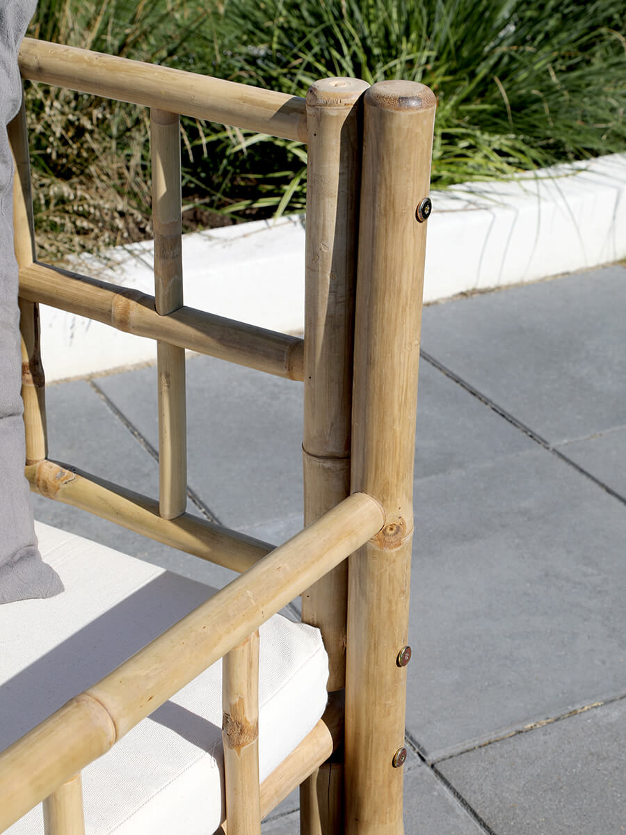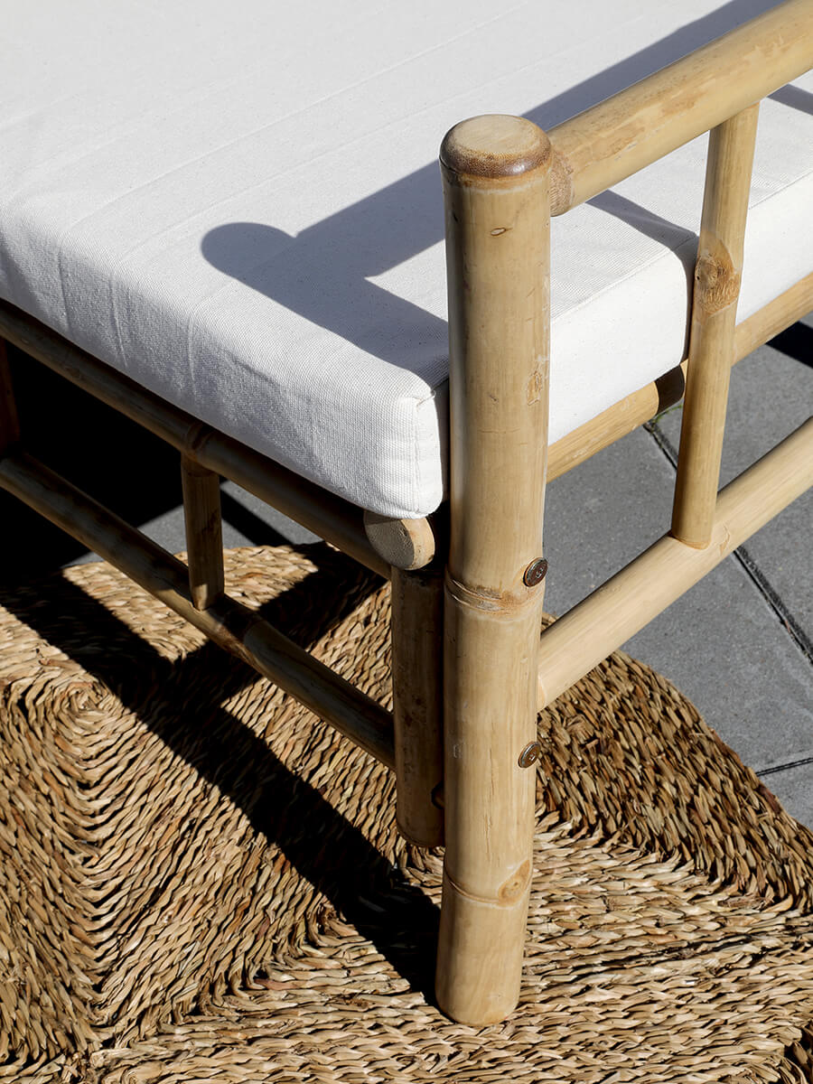 Bambusz kerti szófa párnával a Chic Antique-tól, amely hangulatos társalgót teremt a teraszon. A kanapé 2 személyes, és ülőpárnával érkezik.