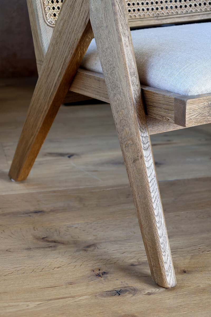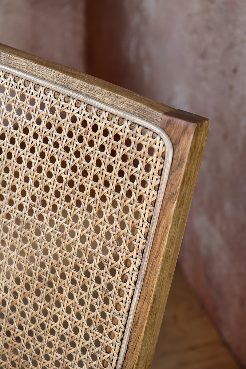 ✔ Természetes anyaghasználat – tölgyfa váz, légies szövött rattan háttámla és puha vászon ülőfelület.