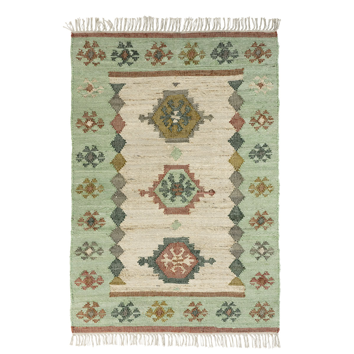 Kézzel szőtt, természetes hatású juta szőnyeg menta árnyalatokkal és finom geometrikus mintával. Meleg, földközeli hangulatot teremt bármely térben.